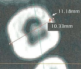 シミュレーションを行う際に障害となるのは、口腔内金属修復物によるメタルアーチファクトです。仮にメタルによる修復物のない症例においても、骨と歯列はX線の吸収係数が異なるため、同一のCT値ではそれらの寸法を正確に3次元化することはできません。例えば臼歯エナメル質のCT値を1048に設定してその寸法を描画する場合、大臼歯の頬舌幅は10.33mmとなります。一方、CT値を482(骨の寸法を3次元化するために用いられる一般的な数値)に設定して寸法を描写する場合、その寸法は11.18mmとなります。※1この数値の幅が結果的にサージカルガイドの正確度および精度の差として現れます。この差を解消するために、石膏製の位置合わせマーカー ※2による画像合成技術の開発を行いました。CTの歯列像を石膏模型の歯列像に置き換えることにより、メタルアーチファクトやCT値、あるいはピクセル値などに影響されない、高精度の画像データのもと、様々なシミュレーションを行えます。