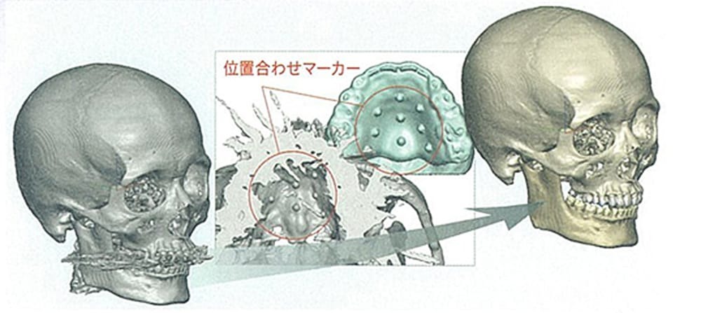 ※2 位置合わせマーカーを指標にデータ合成を行い、CT歯列像を石膏歯列像に置き換えます。
