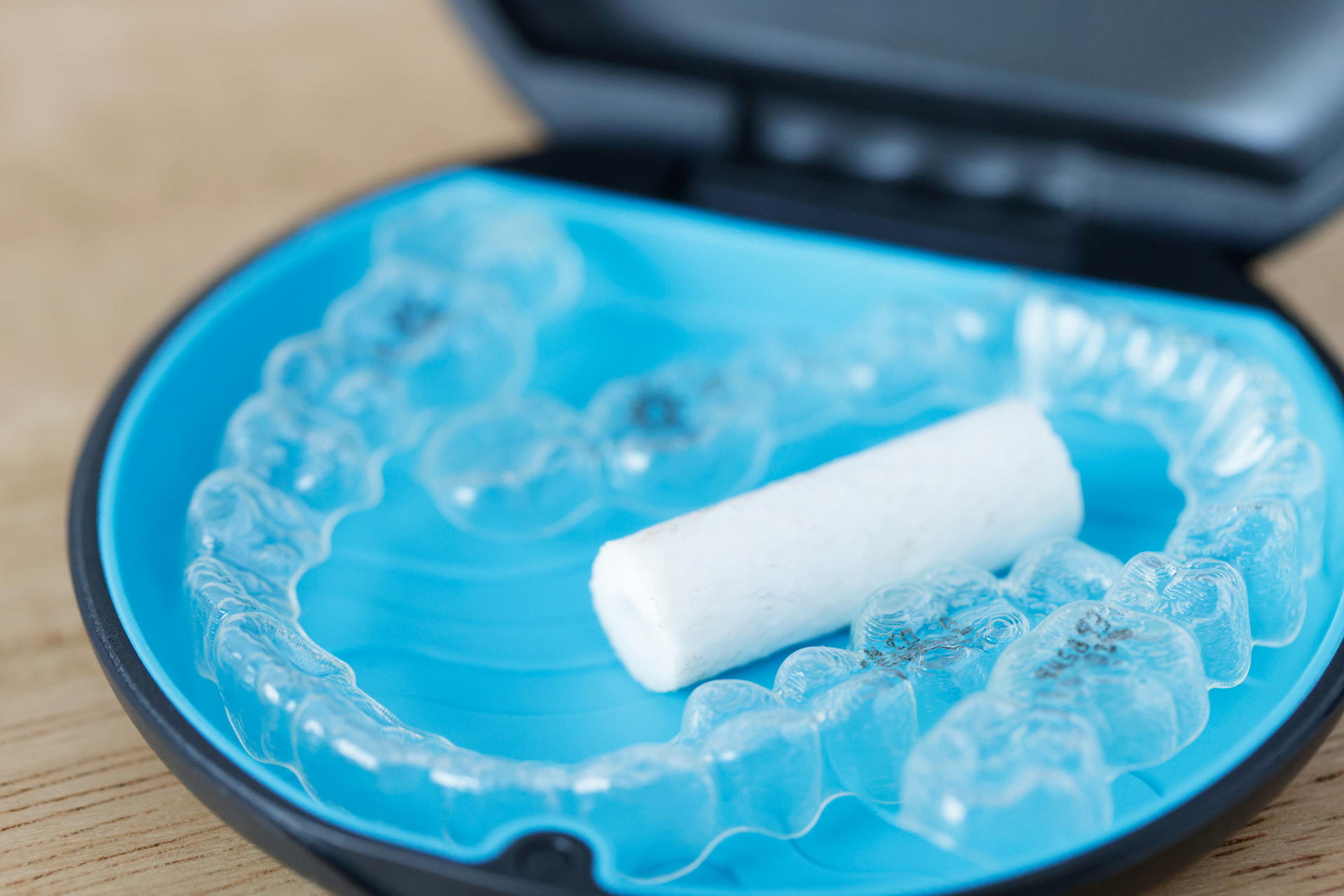 透明なマウスピースは、患者様一人ひとりの歯に合わせて作製される、「インビザライン・アライナー」を装着することで段階的に歯を動かし矯正を行います。