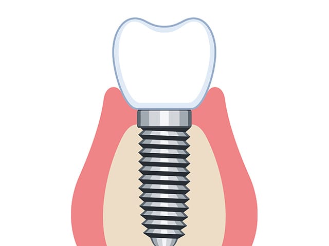 インプラント治療とは、失ってしまった自分の歯の代わりに、人工の歯根を顎の骨に埋め込み、その上に人工の歯を作製して噛み合わせを回復する治療法です。固定性であるためガタついたりせず、自分の歯のように噛めるようになります。