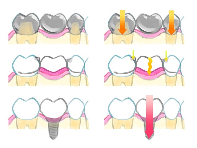 従来のブリッジで治療する場合には、隣の健康な歯を削らなければならないだけでなく、装着後もずっと隣の歯に負担をかけてしまいます。